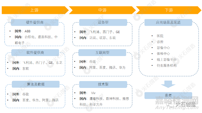 AI醫(yī)療影像產(chǎn)業(yè)鏈上游主要分為硬件提供商、軟件提供商及算法與數(shù)據(jù)公司。硬件提供商主要提供MCU(微處理傳感器)、ASIC(專用集成電路)、DSP(數(shù)字信號處理器)、精密電阻、電源芯片、傳感器等電子元器件,主要公司有ABB公司、臺積電等。軟件提供商主要提供影像采集軟件、影像歸檔、輸出系統(tǒng)和影像打印系統(tǒng)等基礎(chǔ)醫(yī)學(xué)設(shè)備軟件,代表企業(yè)有GE通用、西門子。算法平臺和數(shù)據(jù)平臺則主要提供后期AI產(chǎn)品的學(xué)習(xí)資料,大部分AI醫(yī)學(xué)影像企業(yè)的算法模型源于對各類論文的學(xué)習(xí)。