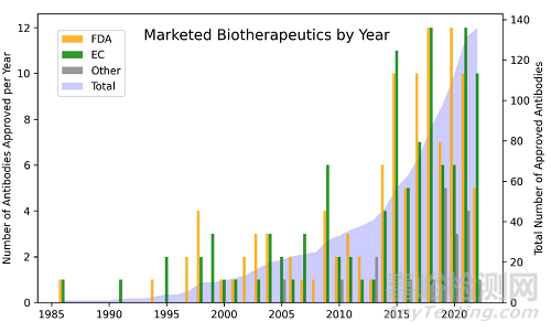 基于抗體的生物療法是制藥市場增長最快的細分市場之一,因為它們具有高選擇性和理想的藥理學(xué)特性,如更長的半衰期,從而相比小分子藥物更加安全有效。截至2021年11月21日,美國和歐盟共有131種抗體藥物獲得批準。此外,臨床開發(fā)中的抗體數(shù)量(I-III期)也在極速增長。2021年,全球抗體藥物市場達到2173億美元,預(yù)計在未來十年內(nèi)將以約15%的年增長率增長。