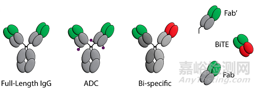 上市的抗體生物有多種分子形式,這89種單克隆抗體中有82種(92%)是全長的單克隆抗體,有1個是全長IgG的雙特異性抗體(emicizumab)。在剩下的六個中,一個是雙特異性T細胞結(jié)合器(blinatumomab),它由靶向CD3和CD19的scFv連接組成;三種是抗原結(jié)合片段(Fab),包括abciximab, idarucizumab和anibizumab;一種是Fab’(certolizumab pegol),這是一種在鉸鏈區(qū)下方被切割的Fab;最后一種只包含抗體的可變區(qū)(Fv),該可變區(qū)與一種名為PE38的外毒素融合。在這89種基于抗體的藥物中,有7種抗體偶聯(lián)藥物(ADC),其中抗體與小分子細胞毒性藥物有效載荷偶聯(lián)。