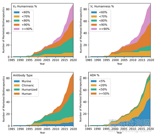 自2003年開始,人源化和全人源抗體的批準率超過了嵌合抗體和鼠源抗體。類似地,抗體藥物的重鏈和輕鏈可變區(qū)(VH和VL)的人源百分比隨著時間的推移而增加。平均而言,VH的人源化程度比VL略低 (86% vs 83%)。