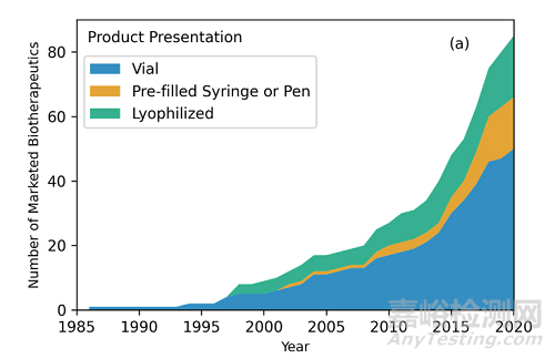 抗體藥物的產(chǎn)品形式包括西林瓶、預(yù)先填充的注射器或注射筆以及凍干粉。關(guān)于產(chǎn)品形式的決策通常涉及到許多因素的考量,早期開發(fā)階段穩(wěn)定性研究中確定的API分子完整性(構(gòu)象穩(wěn)定性、聚集傾向,以及化學(xué)降解的影響,如氧化、脫酰胺和異構(gòu)化)起著關(guān)鍵作用。多年來,西林瓶一直是市場上抗體藥物最常見的產(chǎn)品形式,占到了55.2%。在其余產(chǎn)品形式中,凍干粉的形式占到22.9%,預(yù)填充注射器或注射筆占到21.9%。