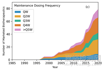 維持給藥頻率是指給患者服用維持劑量的頻率。從患者便利性和醫(yī)療成本的角度來看,這是一個主要考量因素。在89種上市的抗體藥物中,有70種需要定期維持劑量,其中6種提供了不止一種給藥方案。因此,這70種抗體藥物總共有79種給藥方案。這79種給藥方案中有9種為QW(11%),23種為Q2W(29%),10種為Q3W(14%),24種為Q4W(30%),13種≥Q5W(16%)。Q2W和Q4W是抗體藥物最常見的給藥方案。