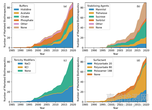 制劑是生物藥開發(fā)的一個重要方面,對穩(wěn)定性、安全性、藥理學(xué)以及給藥途徑都有重要影響。下圖顯示了四種常用非活性成分、緩沖液、穩(wěn)定劑、張力調(diào)節(jié)劑和表面活性劑的時間變化圖。在89種抗體藥物中,87種使用緩沖液,35種使用張力調(diào)節(jié)劑,60種使用穩(wěn)定劑,79種使用表面活性劑。