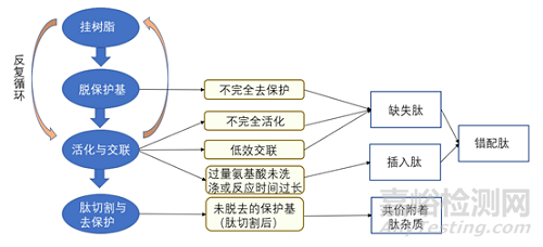 圖1 固相合成流程簡(jiǎn)圖及相關(guān)雜質(zhì)的產(chǎn)生途徑
