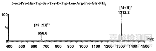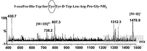 例如:上述某合成多肽藥物A目標(biāo)分子量為1311.5,在樣品中檢測(cè)出分子量1474.9的雜質(zhì),與母肽分子量相差163.4,初步推測(cè)插入酪氨酸,酪氨酸分子量為181,雜質(zhì)分子量=1311.5+181-18=1474.5,與所檢測(cè)到的該雜質(zhì)質(zhì)荷比相符合。