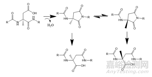 天冬氨酸是容易產(chǎn)生異構(gòu)化的氨基酸,天冬氨酸容易因側(cè)鏈?zhǔn)虬倍h(huán)化到主鏈,形成琥珀酰亞胺,琥珀酰亞胺穩(wěn)定性較差,易水解開環(huán),在開環(huán)的過程可形成異構(gòu)體,同時(shí)還會(huì)產(chǎn)生差向肽副產(chǎn)物,其生成機(jī)制與天冬酰胺脫酰胺相似。