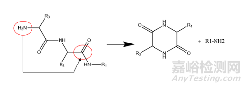 二嗪哌酮是指N端活性基團(tuán)(通常為氨基)進(jìn)攻β位主鏈酰胺鍵的羰基,形成二酮哌嗪類似物,得到缺失兩個(gè)氨基酸的缺失肽,當(dāng)N端氨基酸位阻較小時(shí)反應(yīng)更容易發(fā)生。