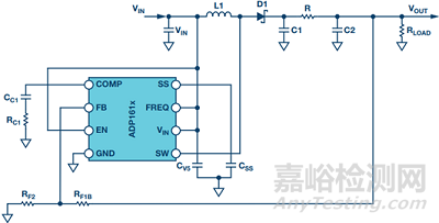 圖3. 在輸出端添加RC濾波器的ADP161x低輸出電流升壓轉換器設計