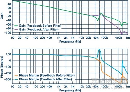 需注意的另一個問題是補償。盡管這可能不符合直覺,但把濾波器放在反饋環(huán)路內部幾乎一直都是更好的做法。這是因為,將其放在反饋環(huán)路內有助于在一定程度上抑制濾波器,消除直流負載偏移和濾波器的串聯(lián)電阻,同時能提供更好的瞬態(tài)響應、更低的振鈴。圖5顯示了一個升壓轉換器的波特圖,其在輸出端添加了LC濾波器輸出。