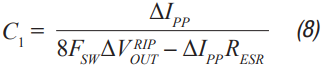 正如之前的拓撲,選擇C1,使其等于沒有輸出濾波器時的情況。10 mV p-p至100 mV p-p是個不錯的開始,具體取決于最終目標輸出紋波。C1隨后可通過公式8計算得出。C1在這個拓撲中可以采用比之前拓撲更小的數(shù)值,因為濾波器效率更高。