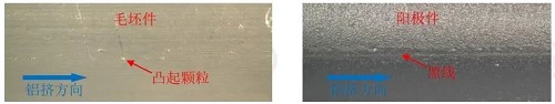 7.綜上,推測(cè)毛坯件上的凸起顆粒應(yīng)為鋁擠時(shí)壓入型材表面的金屬碎屑,而陽(yáng)極件表面的黑線是由于基材表面粗糙度大且存在凹坑造成,這可能與型材表面質(zhì)量有關(guān)。