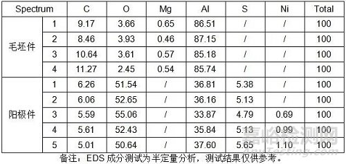 2.陽(yáng)極件黑線區(qū)域陽(yáng)極膜較為粗糙,且存在大小不一的凹坑,其成分未見(jiàn)異常;