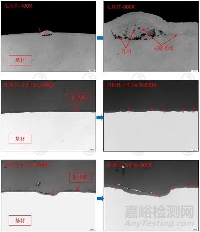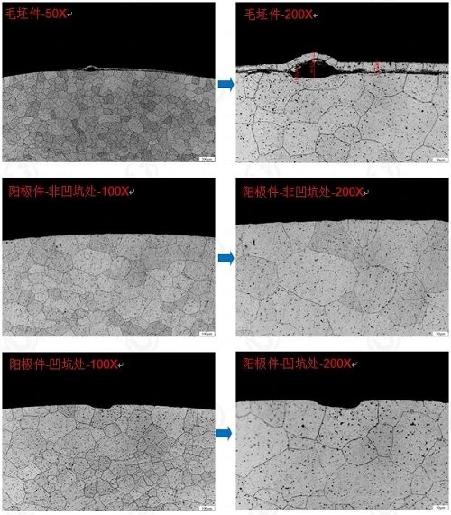 6.經(jīng)金相腐蝕后,毛坯件截面拋光態(tài)下的灰暗區(qū)域被優(yōu)先腐蝕而形成大的孔洞和縫隙,陽(yáng)極件截面金相組織未見(jiàn)明顯異常;