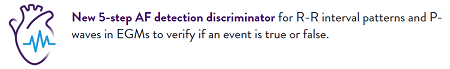 具有新的5步房顫檢測鑒別器,用于檢測心電圖中的R-R間隔模式和P波,以驗(yàn)證事件是真是假。