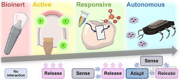 技術和制造工具的最新進展使“智能”牙科材料的開發(fā)成為可能。一般來說,“智能”生物材料會根據(jù)刺激改變一個或多個性能。例如,在疾病的進展期可以觸發(fā)智能生物材料在需要的時刻釋放用于治療的特定藥物。智能生物材料的定義非常寬泛,經(jīng)常被誤解,而且不具有包容性,阻礙了具有不同“智能”功能的生物材料的識別和分類。