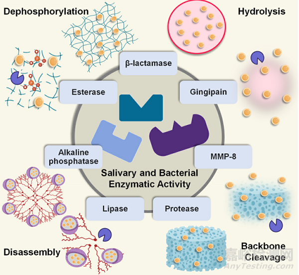 通常,酶響應性生物材料可以被編程為對不同的酶做出反應,包括細菌(即酯酶、磷酸酶、磷脂酶、β-內(nèi)酰胺酶和明膠酶)、細胞表面酶(即MMPs)和唾液(即脂肪酶、蛋白酶、酯酶、α-淀粉酶、脫水酶、溶菌酶)(圖4)。在這類生物材料中,酶響應在催化過程中具有高效性、高選擇性和特異性,避免了傳統(tǒng)抗菌療法不分青紅皂白地殺死細菌的局限性。在酶響應系統(tǒng)中,抗微生物劑在可降解載體(例如,聚(丁二酸乙二醇酯)(PES)、聚己內(nèi)酯(PCL)、透明質(zhì)酸、PEG)通過暴露于酶活性而降解后釋放。酶可能導致載體中的水解、溶脹、主鏈斷裂、降解、分解、磷酸化和去磷酸化,從而導致制劑在靶位點釋放。
