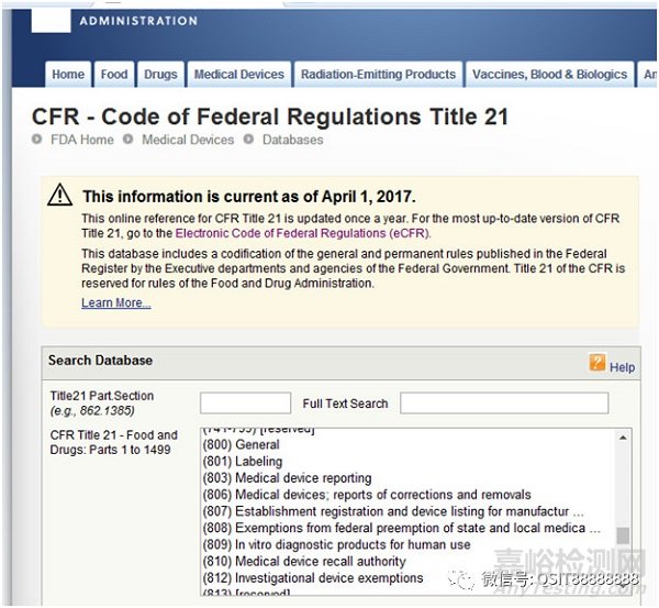 CFR 21是對食品、藥品、醫(yī)療器械的規(guī)定,共9卷,由1-99部分、100-169部分、170-199部分、200-299部分、300-499部分、500-599部分、600-799部分、800-1299部分及1300至結束組成。第8卷的800-1299部分為醫(yī)療器械的法令。公眾可以在FDA官網上查詢相應的FDA的法規(guī)。