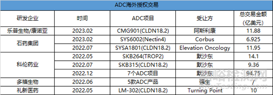 首先,從靶點的布局來看, ADC 藥物研發(fā)主要集中在 HER2、TROP2、CD 家族等臨床驗證能夠成藥的靶點?;贏DC技術(shù)平臺的發(fā)展,一些藥企正在進(jìn)軍Claudin18.2、ROR1和TF等新興靶點。國內(nèi)藥企樂普生物在ADC布局上展現(xiàn)了自己一套方案,在早期管線上,使用HER2這一類成熟的靶點驗證平臺,之后,布局差異化靶點如TF、Claudin 18.2。今年2月,樂普生物與阿斯利康達(dá)成全球獨家授權(quán)協(xié)議,宣布將Claudin18.2 ADC新藥CMG901給阿斯利康,并獲得6300萬美元預(yù)付款和11.25億美元里程碑付款。早在2022年7月,科倫博泰就將其管線中產(chǎn)品應(yīng)為靶向Claudin 18.2 的ADC新藥(SKB315)授權(quán)給了默沙東。據(jù)統(tǒng)計,2022年,科倫博泰與默沙東已達(dá)成3次ADC交易,金額超百億美元。不僅是樂普生物和科倫博泰,在過去的一年半時間里,國內(nèi)共有多款A(yù)DC藥物實現(xiàn)license out,包括石藥集團(tuán)和多禧生物等藥企,交易總金額高達(dá)180億美元。由此看來,國產(chǎn)ADC產(chǎn)品出海勢頭強(qiáng)勁,也說明了國內(nèi)藥企在ADC的研發(fā)實力不容小覷。當(dāng)前形式,ADC企業(yè)對于靶點布局要有敏銳的思考與深入的探究,避開內(nèi)卷,走出差異化道路,才能快速實現(xiàn)產(chǎn)品商業(yè)化。