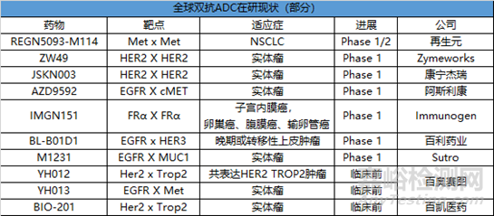 此外,百愷醫(yī)藥的BIO-201,靶向Her2 /Trop2的雙抗ADC;百奧賽圖的YH012,同樣是靶向Her2 /Trop2的雙抗ADC;YH013,EGFR / Met的雙抗ADC也都處于不同的開發(fā)階段。