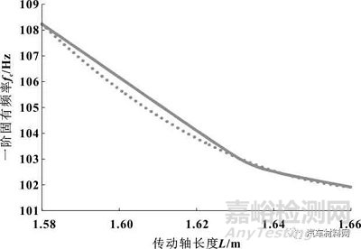 圖4 傳動(dòng)軸長(zhǎng)度與其1階固有頻率關(guān)系曲線