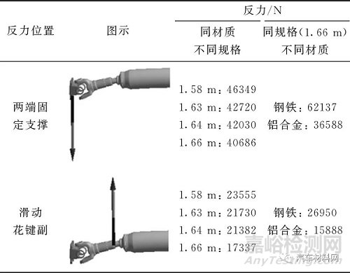 由表5可知,不同傳動(dòng)軸長(zhǎng)度下兩端固定處和花鍵副處的受力呈現(xiàn)出明顯差異,長(zhǎng)度越長(zhǎng),反力越小,萬(wàn)向節(jié)受到的動(dòng)載荷也越小,有利于保證其使用壽命。另外,傳動(dòng)軸材質(zhì)的改變也會(huì)顯著影響萬(wàn)向節(jié)所受動(dòng)載荷,傳動(dòng)軸總成更輕的材質(zhì)可有效降低高速振動(dòng)工況下萬(wàn)向節(jié)軸承受到的激勵(lì)載荷,有利于提高萬(wàn)向節(jié)的使用壽命。