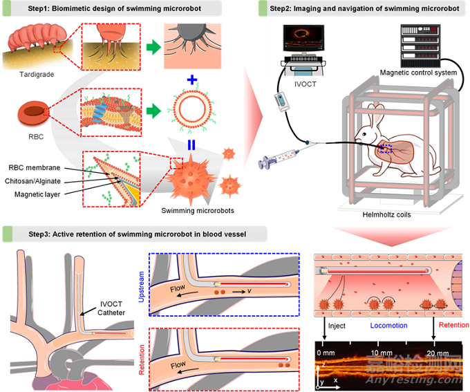針對(duì)上述問(wèn)題,研究團(tuán)隊(duì)設(shè)計(jì)了一種仿水熊蟲(chóng)醫(yī)用微納機(jī)器人,可以讓機(jī)器人“跑得更快”,其模仿緩步動(dòng)物水熊蟲(chóng)利用爪子在動(dòng)態(tài)環(huán)境中的運(yùn)動(dòng)方式設(shè)計(jì)了爪形表面結(jié)構(gòu),以提高微納機(jī)器人的驅(qū)動(dòng)效率,實(shí)現(xiàn)了讓直徑20微米的機(jī)器人可在20000微米/秒的靜脈血流環(huán)境中高效運(yùn)動(dòng)。為讓機(jī)器人“停得住”,團(tuán)隊(duì)通過(guò)多磁場(chǎng)復(fù)合調(diào)控技術(shù),實(shí)現(xiàn)了微納機(jī)器人在生物組織表面可控駐停及藥物靶向釋放,駐停時(shí)間大于36小時(shí)。該研究可顯著提高藥物靶向遞送效率,為惡性腫瘤精準(zhǔn)治療提供新思路。