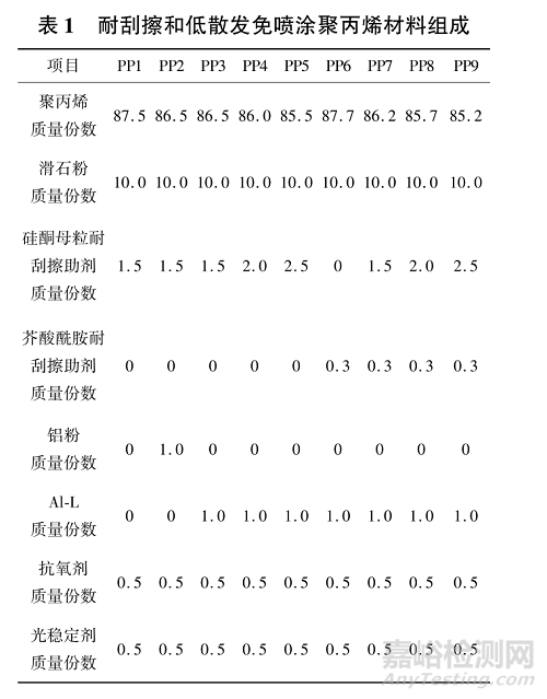 通過對鋁粉原料進行前處理,制備了低散發(fā)的效果顏料(Al?L),再采用此效果顏料制備了低氣味、低散發(fā)的免噴涂聚丙烯材料,詳細研究免噴涂聚丙烯材料的耐刮擦性能。為了方便對比,效果顏料的添加量和滑石粉含量僅選用單一含量。