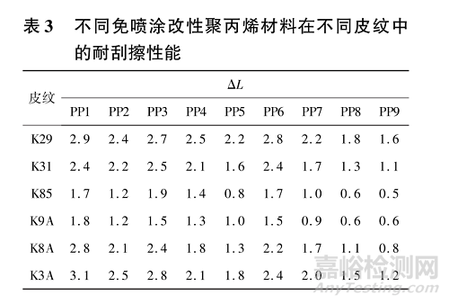 從表3可以看出:耐刮擦助劑的含量增加,材料的耐刮擦性能提升(PP3~PP5),以K9A皮紋為例,當硅酮母粒耐刮擦助劑質量份數(shù)為1.5時,ΔL為1.5,耐刮擦助劑質量份數(shù)增加至2.0時,ΔL為1.3,繼續(xù)增加到2.5時,ΔL為1.0。