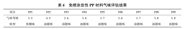 表4為免噴涂聚丙烯材料粒子的氣味評估結果