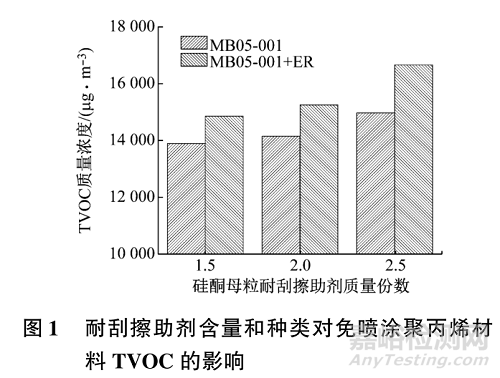耐刮擦助劑添加會導致材料的TVOC質量濃度增加(PP3~PP5),當硅酮母粒耐刮擦助劑的質量份數(shù)從1.5分別增加到2.0和2.5時,免噴涂材料(PP3)的TVOC質量濃度從13855μg/m3分別增加到14137μg/m3和14962μg/m3。