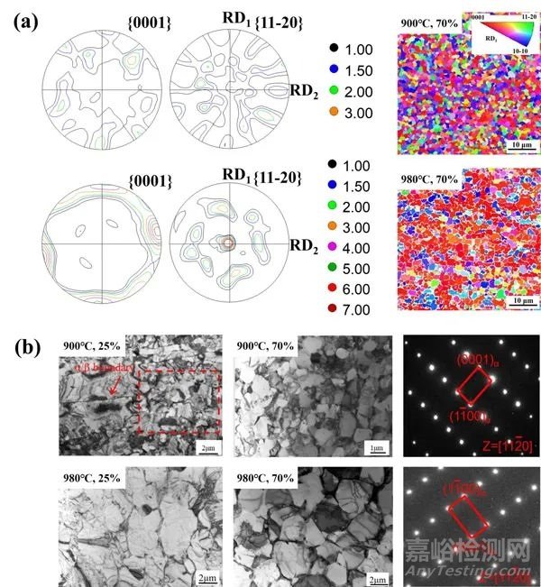 圖1 α相的球化機(jī)制與微織構(gòu)的形成聯(lián)系:(a)不同變形溫度試樣宏觀織構(gòu);(b)α相晶體取向分布;(c)TEM明場像及選區(qū)電子衍射圖像