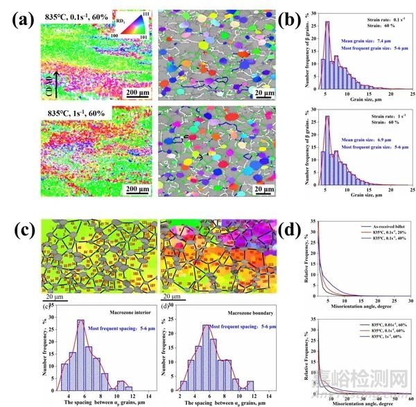圖2 微織構(gòu)“頑固性”與初生α相釘扎作用聯(lián)系:(a)高變形量和高變形速率條件下的初生α相和β相晶體取向;(b)β相晶粒尺寸分布;(c)初生α相間距測量及分布;(d)β相取向差分布