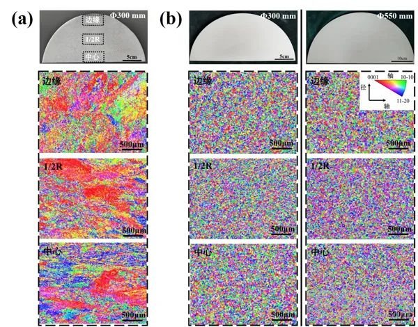 圖3 鍛造工藝優(yōu)化前后棒材晶體取向?qū)Ρ龋海╝)優(yōu)化前Φ300mm棒材低倍組織及其晶體取向;(b)優(yōu)化后Φ300mm和Φ550mm棒材低倍組織及其晶體取向