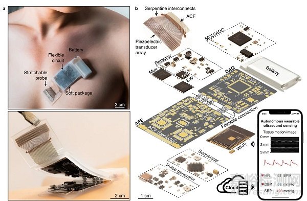 1.無(wú)線連接:通過(guò)將超聲波探頭和微型控制電子器件集成在柔軟的可穿戴設(shè)備中,實(shí)現(xiàn)了無(wú)線通信。多個(gè)傳感信道從人體采集的數(shù)據(jù)在設(shè)備上進(jìn)行預(yù)處理,然后通過(guò)無(wú)線方式傳輸?shù)胶蠖私邮掌鳌_@種無(wú)線連接技術(shù)可以消除傳統(tǒng)超聲波檢查需要有線連接的限制,從而讓配戴者可以自由移動(dòng)。
