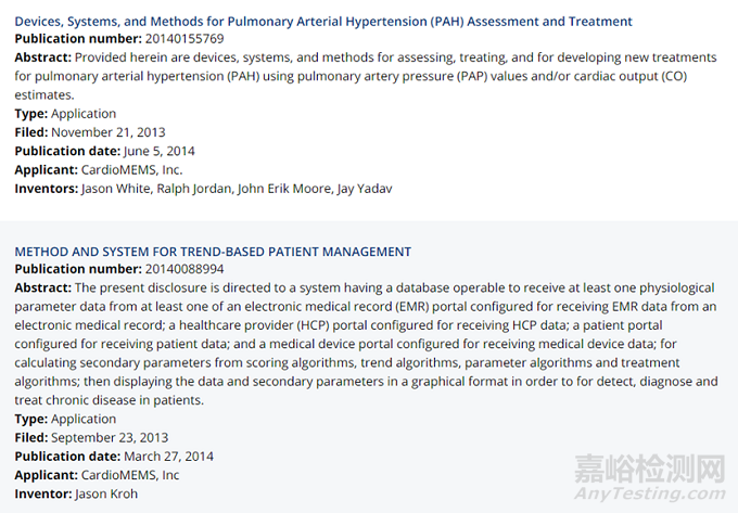 如上圖1,這個永久肺動脈PA植入物早在2014年5月即獲得FDA批準(zhǔn),當(dāng)時它甚至還不屬于圣某廠(不過早在2010年圣某廠已經(jīng)很有遠(yuǎn)見地以6,000萬美金購買了其19%的股份,并已擁有了購買選擇權(quán);最終同樣在2014年以3.75億美金收購了剩余的81%)。作為第一個植入式肺動脈壓力測量器械,CardioMEMS HF系統(tǒng)的目標(biāo)人群一直是心力衰竭患者,植入后能夠在多個場景下(醫(yī)生辦公室、診所、醫(yī)院或患者家中)收集數(shù)據(jù),其收集的數(shù)據(jù)包括:1)肺動脈PA壓力波形;2)PA收縮壓、舒張壓和平均壓;3)心率,這些血流動力學(xué)數(shù)據(jù)被傳輸?shù)桨踩珨?shù)據(jù)庫,以作為心衰患者監(jiān)測的一部分,指導(dǎo)治療。其主要專利如下: