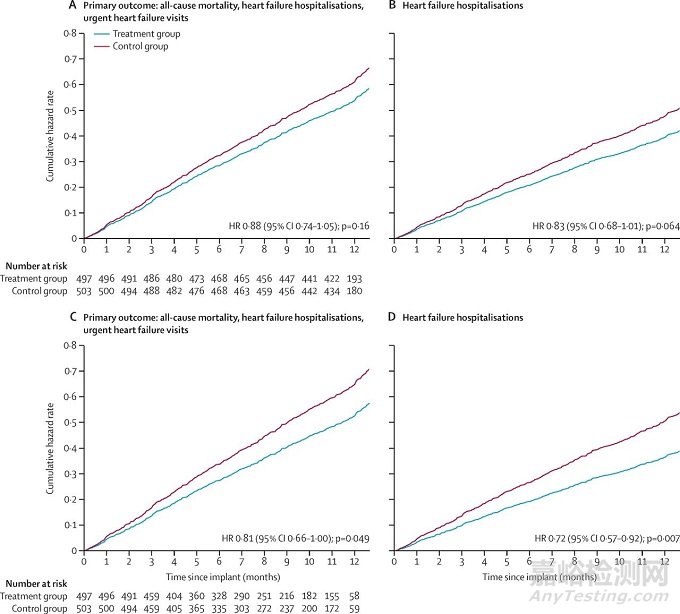 圖9 GUIDE-HF研究,主要復(fù)合終點(diǎn)以及心衰住院的累積風(fēng)險率曲線,其中(C)和(D)為COVID-19大流行前的數(shù)據(jù)分析