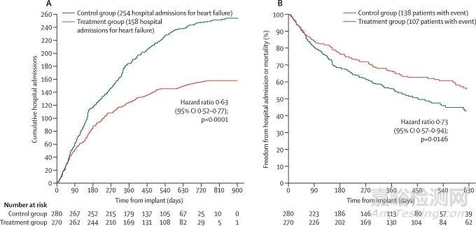 圖7 Champion研究,在整個隨機(jī)單盲隨訪期間的心衰相關(guān)累計住院數(shù)(A),以及整個隨訪期間無首次心衰相關(guān)的住院或死亡率(B)