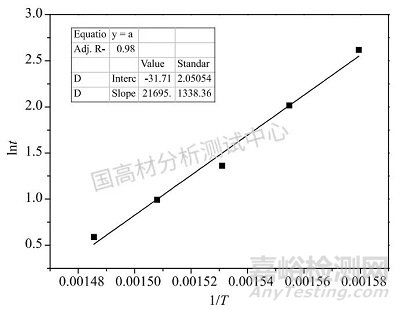 在實(shí)驗(yàn)選取的溫度內(nèi),活化能E為常數(shù),將實(shí)驗(yàn)數(shù)據(jù)作lnti與1/Ti的線性擬合方程即可得到老化壽命方程。