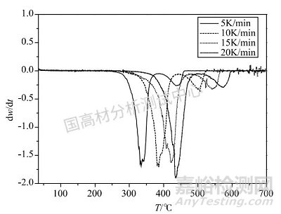 由PET的TG曲線可以看到PET的在空氣中的熱分解分為兩個(gè)階段:第一個(gè)階段的起始點(diǎn)溫度約在300℃左右,這個(gè)階段是PET的主要失重階段,PET大分子鏈在此階段大量分解,第二階段的起始溫度約在450℃左右,在整個(gè)PET分解過程中所占的比重不大,這部分分解主要是PET中有未反應(yīng)完的單體和小分子物質(zhì)。當(dāng)?shù)谝浑A段失重發(fā)生時(shí),
