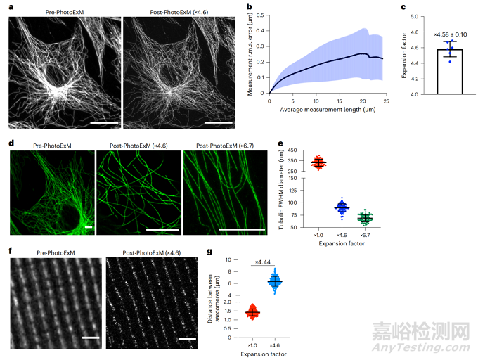 為了量化PhotoExM水凝膠的保真度和均勻性,肌細胞(C2C12細胞)被培養(yǎng)在蓋玻片上并固定并免疫標記α-管蛋白作為觀察樣品。在大約×4.6的樣本擴展之后,對相同的區(qū)域進行成像。通過計算樣品特征的均方根(r.m.s.),將誤差作為平均測量長度的函數(shù)。在20微米以上,平均r.m.s.誤差為2.8%,這與先前的ExM方法相當(dāng),但PhotoExM具有更快的聚合動力學(xué)(PhotoExM的70秒與ExM的90分鐘)。接下來通過量化4.6-6.7倍擴增前后的微管全寬(FWHM)來評估PhotoExM實現(xiàn)的分辨率提升。擴增前測量的微管直徑為331±32納米,4.6倍擴增后下降到90±8納米,6.7倍擴增后為69±7納米。后者與用一抗和二抗免疫標記的微管的測量直徑(d)相當(dāng)(d≈60-65納米),證明了PhotoExM的超分辨率成像能力。接下來,用PhotoExM來觀察肌肉組織切片。從6個月大的雄性小鼠身上分離出粗大的脛骨前肌縱向切片,固定后用α-肌動蛋白免疫標記,以觀察肌纖維中的肉眼可見度。在不同的肌肉切片中,在×4.6擴展之前和之后對肌節(jié)進行成像,可以對組織樣本內(nèi)的擴展各向同性進行量化。在×4.6擴增前后,肉眼可觀察到的平均距離分別為1.43±0.19和6.35±0.81μm(非標單位)。平均肌節(jié)長度之間的比率為4.44,對應(yīng)的誤差為3.0%,這在PhotoExM過程的3.5%誤差范圍內(nèi)(×4.6擴展)。此外,PhotoExM還可以被用來揭示分離的肌纖維上的肌肉干細胞(Pax7)和肌纖維-ECM界面(dystrophin)的亞細胞結(jié)構(gòu),以及肌肉干細胞周圍的ECM(層粘連蛋白)。
