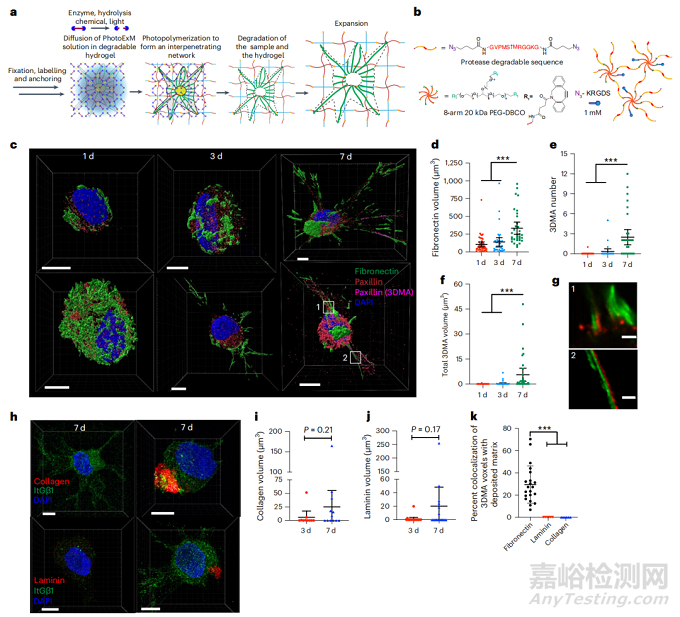 近期,科羅拉多大學(xué)博爾德分校的Kristi S. Anseth團隊為膨脹顯微技術(shù)設(shè)計了一種專用水凝膠(PhotoExM),以減少處理時間,并實現(xiàn)樣品的均勻膨脹。該水凝膠是基于光引發(fā)聚合技術(shù),即快速的光引發(fā)硫醇/丙烯酸酯混合模式聚合,這種聚合不受氧氣的抑制,并單體向生物樣品的擴散(即傳質(zhì))與水凝膠形成的反應(yīng)動力學(xué)解耦,這在膨脹前將細胞嵌入水凝膠中尤其有利。基于該方法,可以實現(xiàn)水凝膠中嵌入的單個細胞的納米級特征成像,以及實現(xiàn)與細胞外微環(huán)境中新生沉積的細胞外基質(zhì)(ECM)分子的相互作用的觀察。該工作以題為“Photo-expansion microscopy enables super-resolution imaging of cells embedded in 3D hydrogels”的文章發(fā)表于Nature Materials上。
