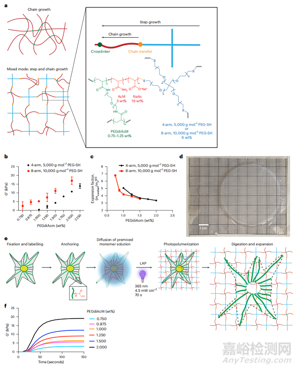 PhotoExM水凝膠是通過光引發(fā)的硫醇/丙烯酸酯混合模式聚合制備。該混合模式反應(yīng)中的網(wǎng)絡(luò)生長通過丙烯酰胺、丙烯酸鈉(16wt%)和聚乙二醇(PEG)-二丙烯酰胺交聯(lián)劑(PEGdiAcM;Mn = 600 g mol-1)的同時鏈式生長共聚進行,再加上多臂PEG-SH和傳播的鏈式生長自由基之間的鏈式傳遞反應(yīng)實現(xiàn)階梯式生長聚合。與純粹的鏈式增長網(wǎng)絡(luò)相比,PhotoExM水凝膠配方的混合模式反應(yīng)機制使網(wǎng)絡(luò)交聯(lián)點的空間位置均勻化,這可以減少擴展后熒光團位置的空間誤差。PhotoExM凝膠具有更高的彈性模量,因此與原始的ExM化學(xué)相比,在處理過程中具有更大的抗變形能力。更值得注意的是,將8臂PEG-SH加入到網(wǎng)絡(luò)中所帶來的階梯式增長特性減少了水凝膠形成所需的交聯(lián)劑(PEGdiAcM)含量,其膨脹率可以通過修改PEGdiAcM的重量百分比輕松調(diào)節(jié)。