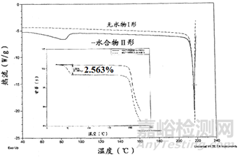 圖2無水物I形和水合物II形的熱分析圖譜(來源文獻1的專利)