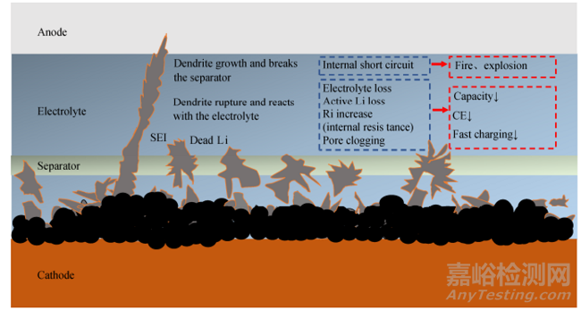 所謂析鋰,是指鋰離子電池充電過程中,鋰離子在負(fù)極側(cè)沒有嵌入負(fù)極材料,而是以金屬鋰的形式在負(fù)極表面析出的異?,F(xiàn)象,在低溫、快充、過充等過程中較容易出現(xiàn)。析出的金屬鋰往往不是形成平整的鍍層,而是以樹枝狀結(jié)晶的形式存在,被稱為鋰枝晶,鋰枝晶在多種商品化的電池負(fù)極材料中都可能出現(xiàn)。