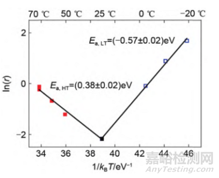 18650型電池在20~70 ℃的溫度范圍內(nèi)循環(huán)的老化行為的阿侖尼烏斯圖