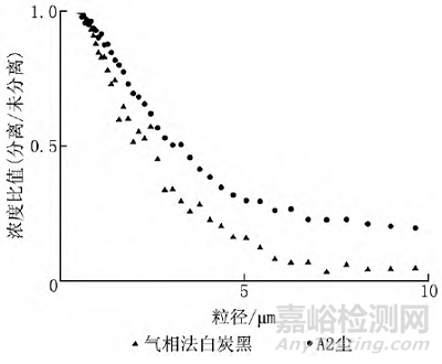 在上述粉塵中,A2塵與氣相法白炭黑在粒徑特性上各具一定代表性,在3.3節(jié)中將進(jìn)一步研究這2種粉塵作為高效過濾器容塵性能試驗(yàn)用塵源的可行性。圖9顯示了在使用分離器與不使用分離器的情況下,A2塵與氣相法白炭黑發(fā)塵濃度各自的比值??芍S粒徑的增大,旋風(fēng)分離器對(duì)粒子的去除效果逐漸增強(qiáng),但由于粉塵堆積密度、團(tuán)聚能力等物理性質(zhì)的差異,分離器對(duì)不同塵源的去除效果有所不同。