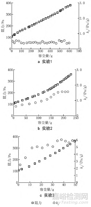 高效過濾器的阻力會(huì)隨容塵量動(dòng)態(tài)增長(zhǎng)。Thomas等人提出高效過濾器的容塵過程可分為深層過濾、過渡和表面過濾3個(gè)階段[15]。其中,深層過濾階段的阻力增長(zhǎng)比較緩慢,而表面過濾階段的阻力則會(huì)呈線性快速增長(zhǎng)。為了更形象地反映高效過濾器在整個(gè)容塵過程中每一時(shí)刻的阻力隨容塵量的增長(zhǎng)速度,判斷過濾器所處容塵階段,引入阻力增長(zhǎng)系數(shù)k2[4]。本文采用阻力增長(zhǎng)曲線中兩點(diǎn)間連線的斜率代表該區(qū)間的k2。圖10顯示了實(shí)驗(yàn)1~3的阻力與k2隨容塵量變化情況。在實(shí)驗(yàn)1中,過濾器阻力在達(dá)到終阻力前,阻力隨容塵量始終呈線性增長(zhǎng),阻力增長(zhǎng)系數(shù)k2始終在一定范圍內(nèi)維持不變。在實(shí)驗(yàn)2中,阻力隨容塵量的增長(zhǎng)速度起初緩慢增長(zhǎng),而后穩(wěn)定在一定范圍內(nèi),k2值整體高于實(shí)驗(yàn)1。在實(shí)驗(yàn)3中,阻力增長(zhǎng)速度同樣呈現(xiàn)先逐漸增長(zhǎng)隨后穩(wěn)定的情況,但k2在實(shí)驗(yàn)開始階段就高于前2組實(shí)驗(yàn),并且很快達(dá)到穩(wěn)定。k2值在實(shí)驗(yàn)過程中總體處于較高水平。
