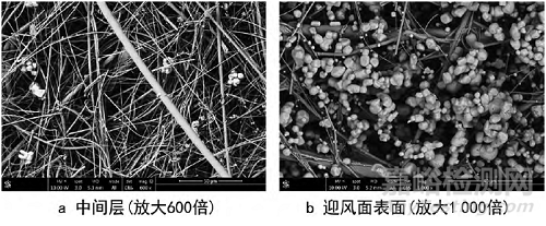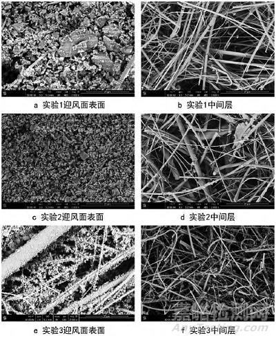 圖6 過濾器樣品在容塵終止時(shí)不同濾料層的掃描電鏡照片