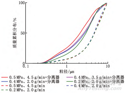 圖7 不同進(jìn)氣壓力與喂塵速率條件下氣相法白炭黑的質(zhì)量累積分布情況