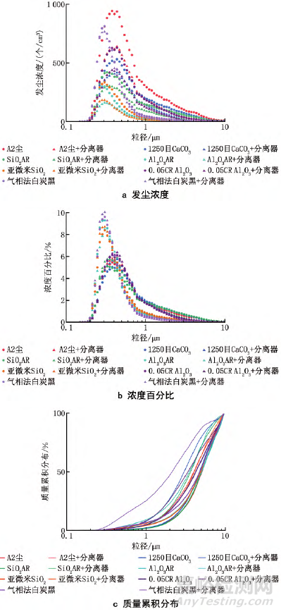圖8 人工塵發(fā)塵濃度、濃度百分比與質(zhì)量累積分布情況